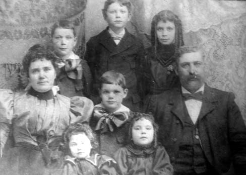 Murphy family photo, circa 1897. Top center is Frank Murphy. Just below, center, is Eddie Murphy, Charlie Murphy is the other boy and the two girls bottom center are Helen and Anna Murphy, Marie Murphy is top right, Charles Murphy, far right is the father and Theresa Murphy, far left, is the mother.